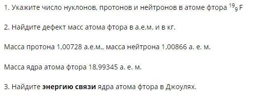 2. Δm = 9 · 1,00728 + 10 · 1,00866 - 18,99345 = 0,15867 а.е.м.