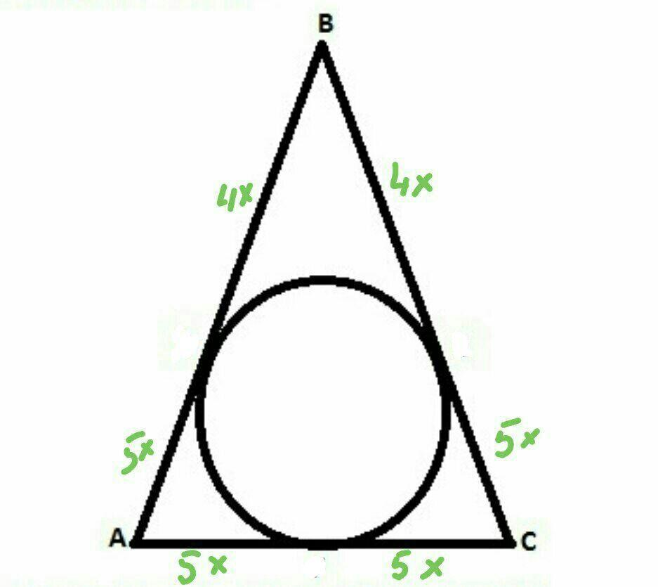 Коло, яке вписане в рівнобедрений трикутник, ділить кожну його сторону на два відрізки. Бічні сторони ділить на відрізки довжиною 4х та 5х (разом 9х), основу - на відрізки 5х та 5х (разом 10х), що за умовою дорівнює 20 см.