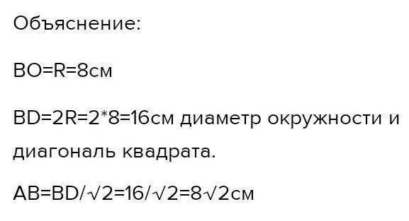 Дано коло радіус якого дорівнює 8 см. Знайдіть сторону правильного чотирикутника, вписаного в дане коло.