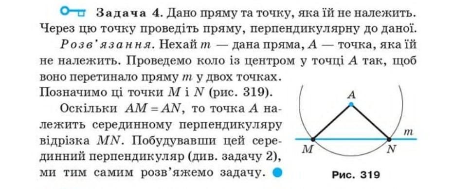 От Задача 4. Дано пряму та точку, яка їй не належить. Через цю точку проведіть пряму, перпендикулярну до даної.