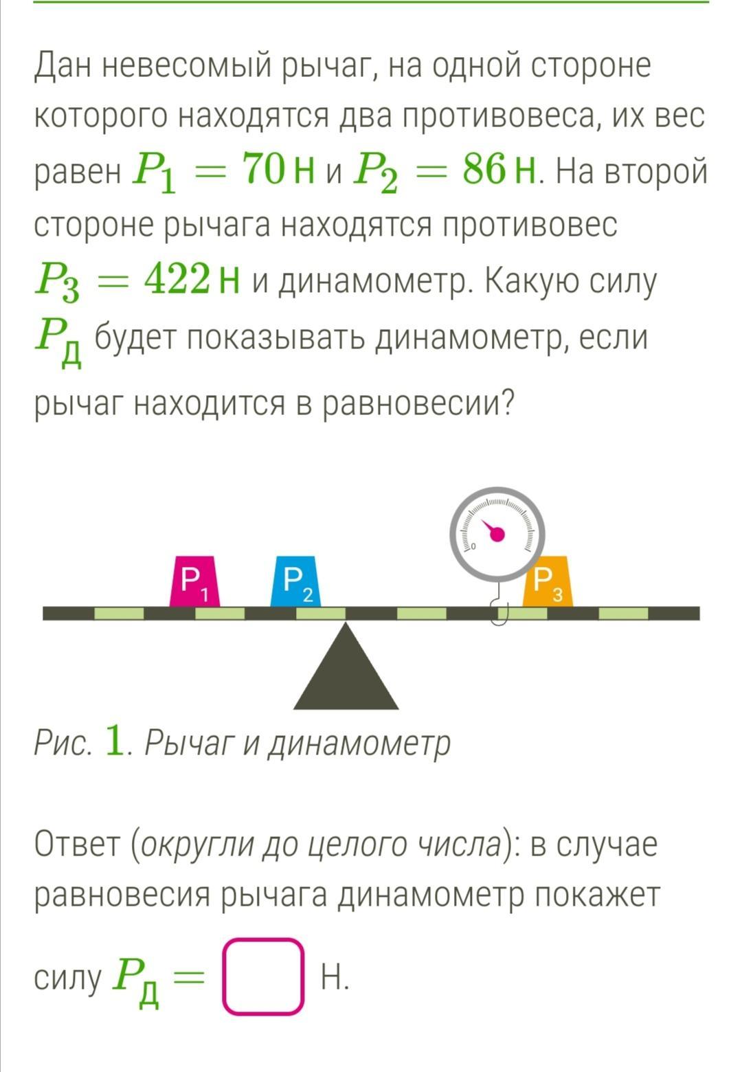 Дан невесомый рычаг, на одной стороне которого находятся два противовеса, их вес равен P1 = 70 Ни P2 86 Н. На второй стороне рычага находятся противовес P3 = 422н и динамометр. Какую силу Рп будет показывать динамометр, если Д рычаг находится в равновесии?