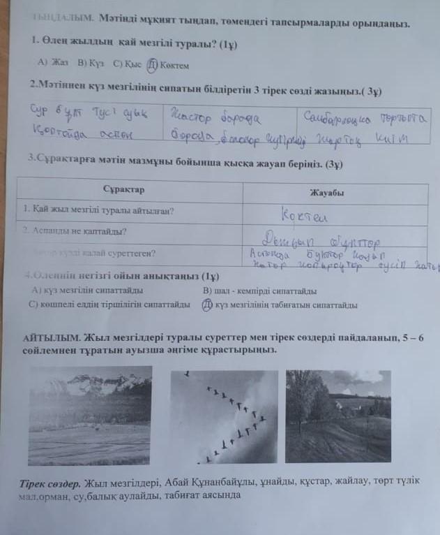 бұл жерде көл,құстар,өзенді көруге болады бұл жерден бірдең ойымызға жаз мезгілі түседі. Жаз жыл мезгілдеріндегі үшінші ең қызық мезгіл жаз мезгілі маған қатты ұнайды бул жерден Абай құнанбаетын жаз деген өленін еске алуға болады ол өленде жазды керемет қылып көрсетеді жайлауға барып,балық аулап мал жайып табиғат аясына шығып серуендеуге ең жайлы мезгіл.Жаз ең керемет мезгіл