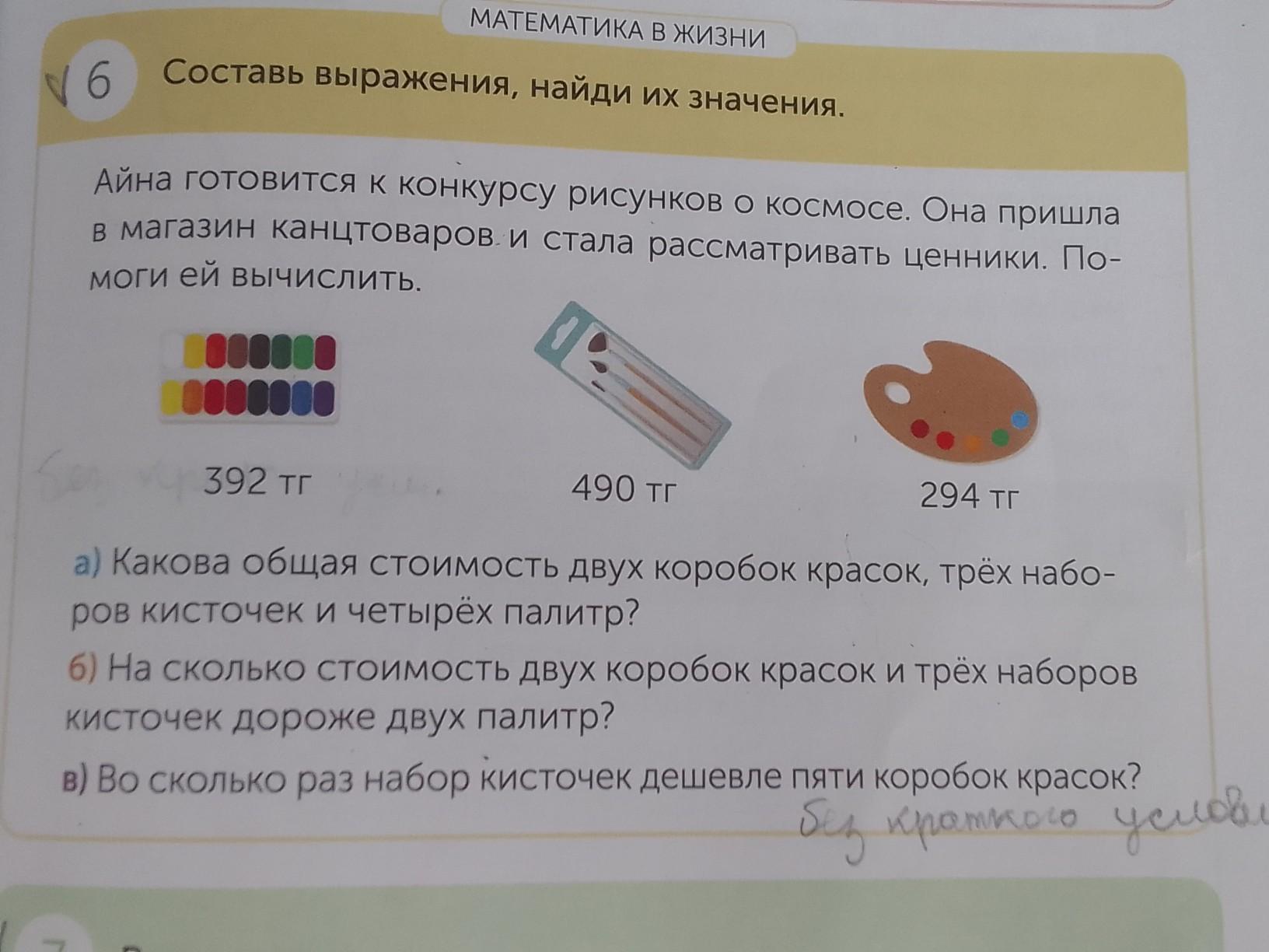 в) Во сколько раз набор кисточек дешевле пяти коробок красок?