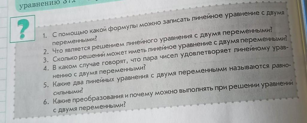 1 ? 1. С помощью какой формулы можно записать линейное уравнение с двумя переменными? 2. Что является решением линейного уравнения с двумя переменными? 3. Сколько решений может иметь линейное уравнение с двумя переменными? 4. В каком случае говорят, что пара чисел удовлетворяет линейному урав- нению с двумя переменными? 5. Какие два линейных уравнения с двумя переменными называются равно- сильными? 6. Какие преобразования и почему можно выполнять при решении уравнений с двумя переменными?