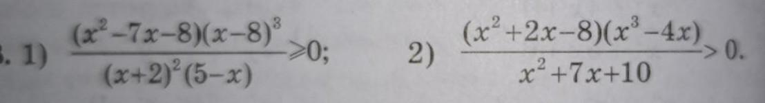 \displaystyle\bf\\2)\\\\\frac{(x^{2} +2x-8)(x^{3} -4x)}{x^{2} +7x+10} > 0\\\\\\\frac{(x-2)(x+4)\cdot x\cdot(x-2)(x+2)}{(x+2)(x+5)} > 0\\\\\\\frac{(x-2)^{2} (x+4)\cdot x\cdot(x+2)}{(x+2)(x+5)} > 0\\\\\\---(-5)+++(-4)---(-2)+++(0)+++(2)+++\\\\\\Otvet \ : \ x\in(-5 \ ; \ -4) \ \cup \ (-2 \ , \ 0) \ \cup \ (0 \ ; \ 2) \ \cup \ (2 \ ; \ +\infty)