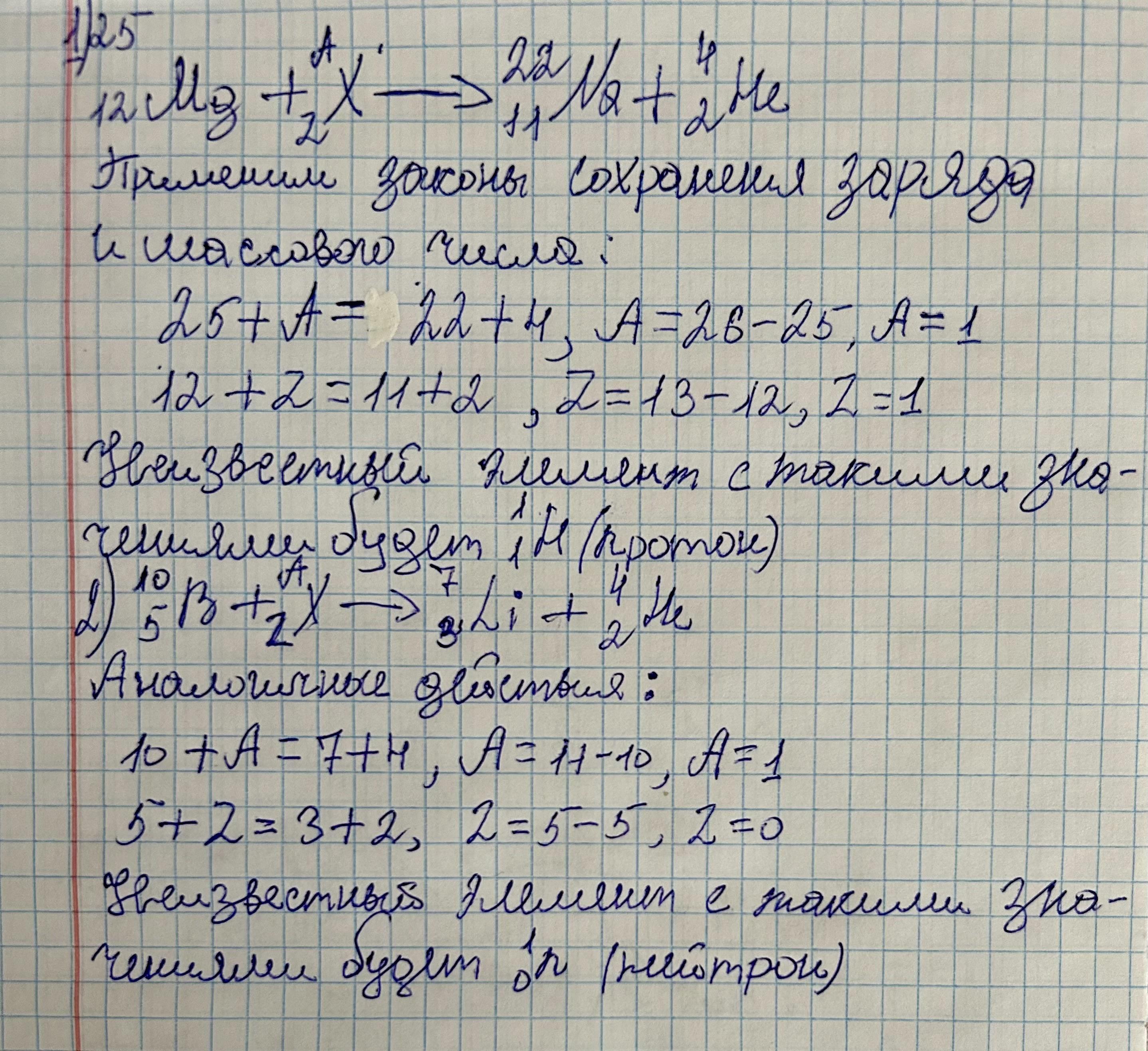 Какая бомбардирующая частица применялась в следующей ядерной реакции 1. 25/12Mg+?→22/11Na+4/2He 2. 10/5B+?→7/3Li+4/2He?
