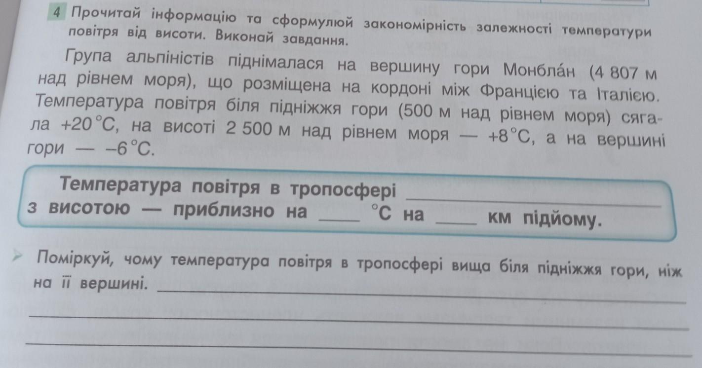 Прочитай інформацію та сформулюй закономірність залежності температури повітря від висоти. Виконай завдання.