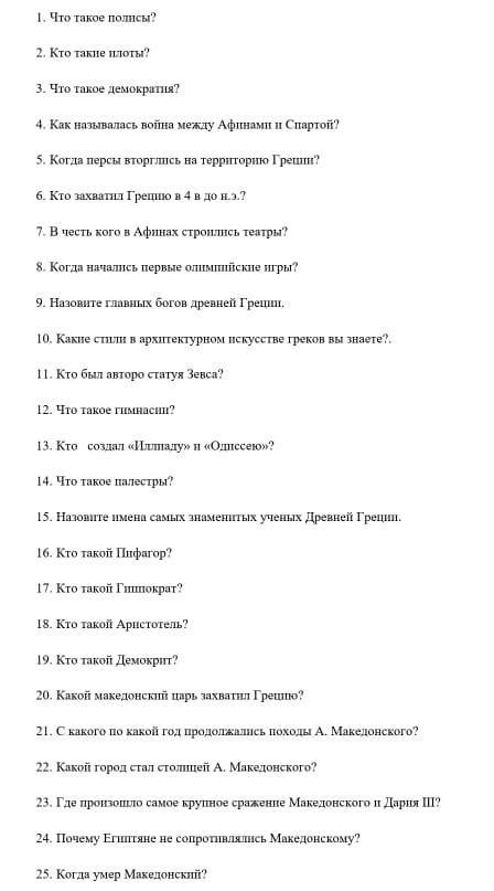 1. Что такое полисы? 2. Кто такие плоты? 3. Что такое демократия? 4. Как называлась война между Афинами и Спартой? 5. Когда персы вторглись на территорию Греции? 6. Кто захватил Грецию в 4 в до н.э.? 7. В честь кого в Афинах строились театры? 8. Когда начались первые олимпийские игры? 9. Назовите главных богов древней Греции. 10. Какие стили в архитектурном искусстве греков вы знаете?. 11. Кто был авторо статуя Зевса? 12. Что такое гимнасин? 13. Кто создал Иллиаду» и «Одиссею»? 14. Что такое палестры? 15. Назовите имена самых знаменитых ученых Древней Греции. 16. Кто такой Пифагор? 17. Кто такой Гиппократ? 18. Кто такой Аристотель? 19. Кто такой Демокрит? 20. Какой македонский царь захватил Грецию? 21. С какого по какой год продолжались походы А. Македонского? 22. Какой город стал столицей А. Македонского? 23. Где произошло самое крупное сражение Македонского и Дария Ш? 24. Почему Египтяне не сопротивлялись Македонскому? 25. Когда умер Македонский?