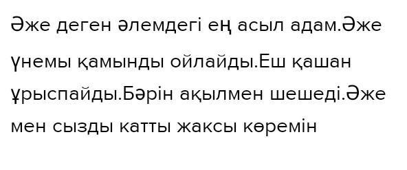 1. «Төрт сөйлем» тәсілі арқылы әңгіме туралы пікірлеріңді білдіріңдер: Пікір. Тыңдаған мәтін бойынша өзіндік пікірлеріңді бір сөйлеммен айтындар немесе жазындар. Дәлел. Пікірлерінді бір сөйлеммен дәлелдеңдер. Мысал. Пікірлеріңді өмірмен байланыстырып, мысалдар келтіріңдер. Қорытынды. Шығарма мазмұны бойынша қорытынды шығарыңдар.