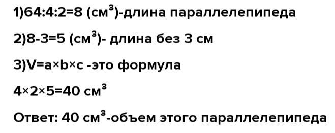 РАБОТА В ПАРЕ 6А Найди объём фигуры. Объём параллелепипеда равен 64 см3, ширина - 4 см, высота - 2 см. Длину этого параллелепипеда уменьшили на 3 см. Определи объём получившегося параллелепипеда. Фото сделайте пж ответа СРОЧНО