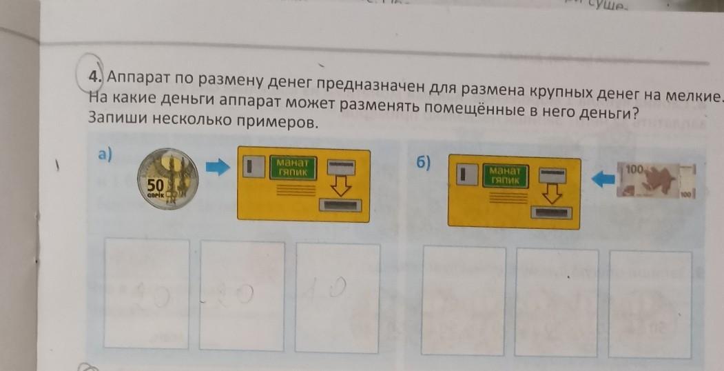 4. Аппарат по размену денег предназначен для размена крупных денег на мелкие. На какие деньги аппарат может разменять помещённые в него деньги? Запиши несколько примеров. a) 50 corir манат гяпик В 6) манат гяпик КТ 100 100 СО гавав какими пат монетами