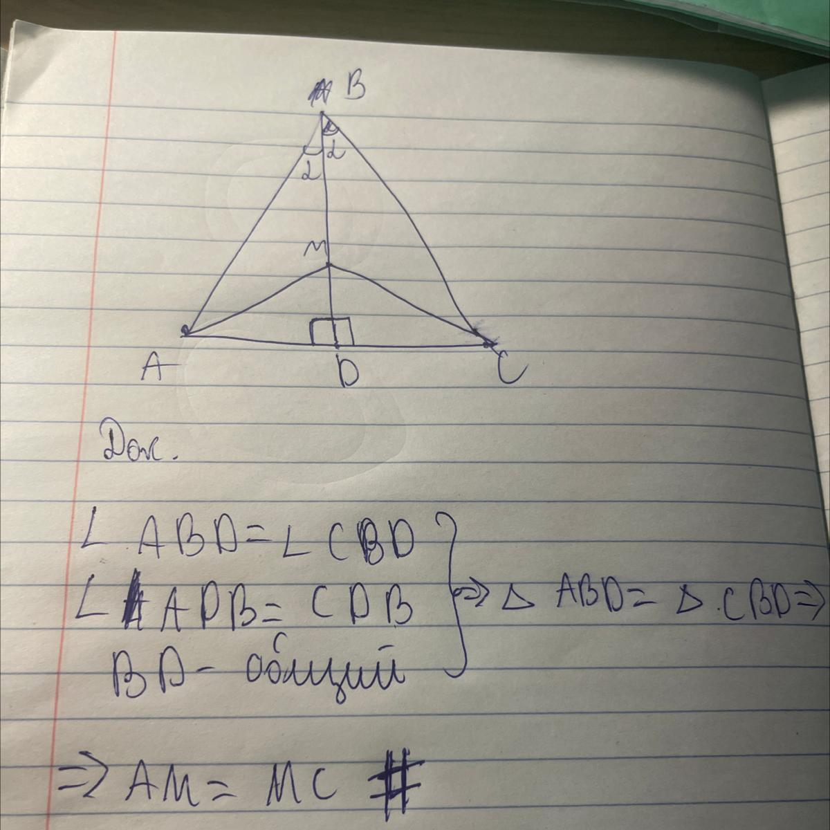 13. BD - высота треугольника АВС. угол ABD = угол CBD. Произвольно выбранная на высоте BD точка М соединена отрезками с точками А и С. Докажите, что АМ=МС