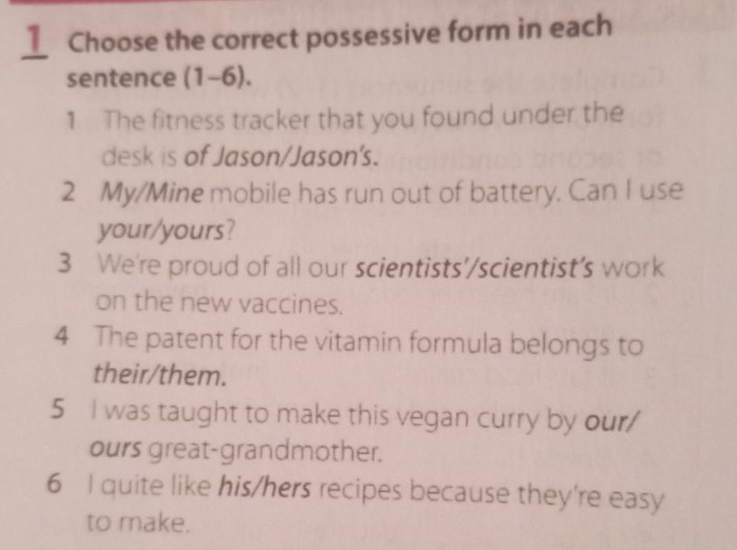 1 Choose the correct possessive form in each sentence (1-6). 1 The fitness tracker that you found under the desk is of Jason/Jason's. 2 My/Mine mobile has run out of battery. Can I use your/yours? 3 We're proud of all our scientists'/scientist's work on the new vaccines. 4 The patent for the vitamin formula belongs to their/them. 5 I was taught to make this vegan curry by our/ ours great-grandmother. 6 I quite like his/hers recipes because they're easy to make.