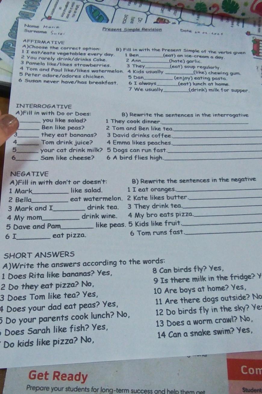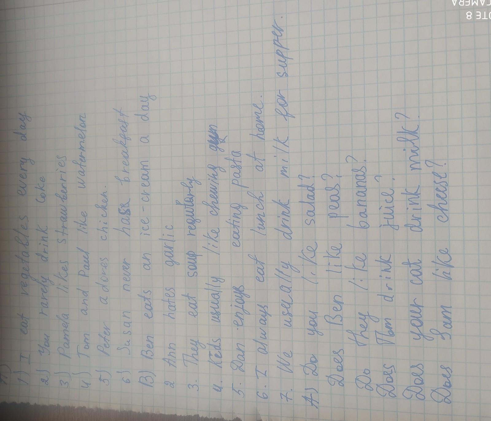 На he she it всегда пишется does на We i they you пишется всегда do на NEGATIVE 1Mark doesn't like salad 2 Bella doesn't eat watermelon 3 Mark and i don't drink tea 4 My mom doesn't drink wine 5 Dave and Pam don't like peas 6 I don't eat pizza а на остальные просто ставишь don't или doesn't на interrogative точно также do или does на последнем 1 yes she does 2 No they don't 3 yes he does 4 yes he does 5 No they don't 6 No they don't