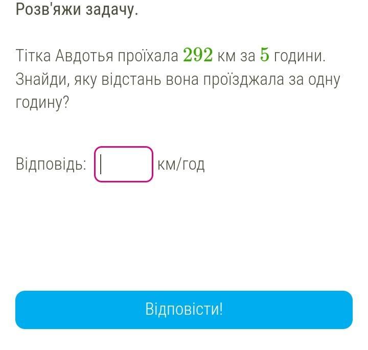 Так як 292 км вона проїхала за 5 годин, нам потрібно поділити відстань на години.