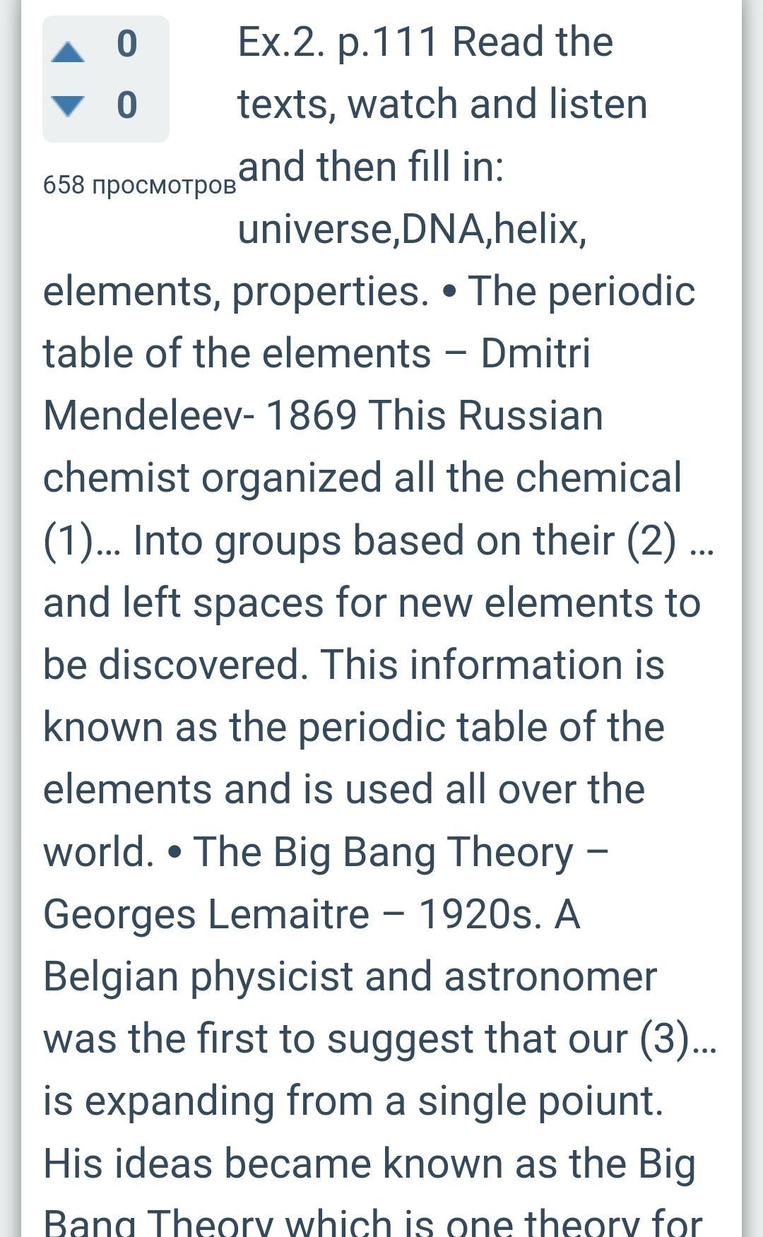 3 1 2 The periodic table of the elements - Dmitri Mendeleev 1869 This Russian chemist organised all of the chemical 1) into groups based on their 2)........... ......... and left spaces for new elements to be discovered. This information is known as the periodic table of the elements and is used all over the world. The Big Bang Theory - Georges Lemaître - 1920s A Belgian physicist and astronomer was the first to suggest that our 3) is expanding from a single point. His ideas became known as the Big Bang Theory which is one theory for how the universe was created. DNA structure - James Watson & Francis Crick - 1953 American scientist James Watson and British scientist Francis Crick discovered that our 4). ...... is not flat, but a 3D structure that twists around in a double-5)