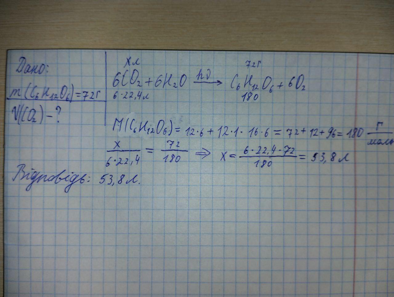 який об'єм вуглекислого газу поглинувся якщо при фотосинтезі утворилось 72 г глюкози