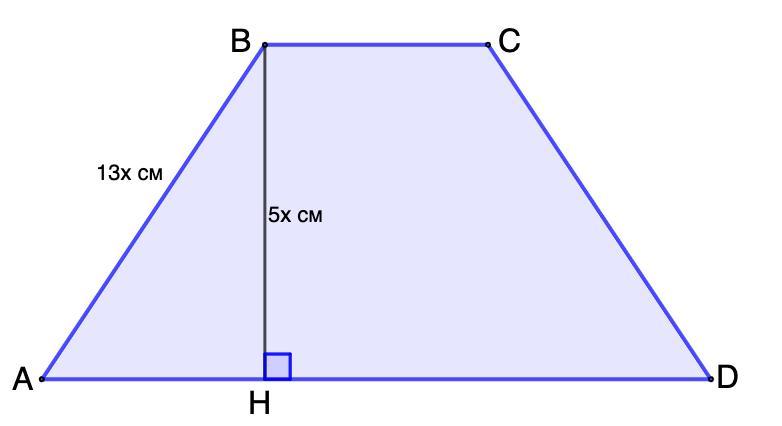 В равносторонней трапеции, разница оснований равна 48 см, а периметр 128 см. Вычислить площадь трапеции, если боковая сторона и высота относятся, как 13 : 5.