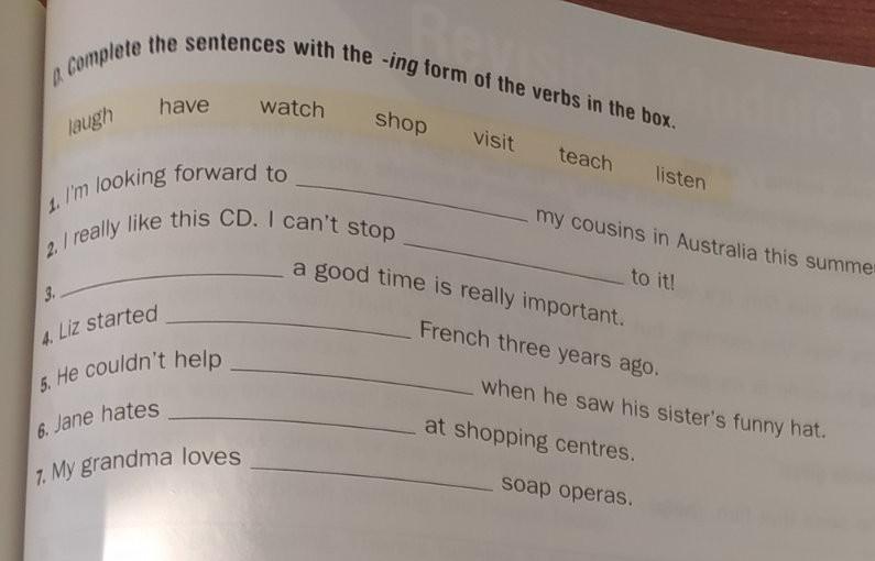laugh have watch 5. 1. I'm looking forward to 2. I really like this CD. I can't stop 3. 4. Liz started He couldn't help shop 6. Jane hates 7. My grandma loves the verbs in the box. visit teach listen my cousins in Australia this summer. to it! a good time is really important. French three years ago. when he saw his sister's funny hat. at shopping centres. soap operas.