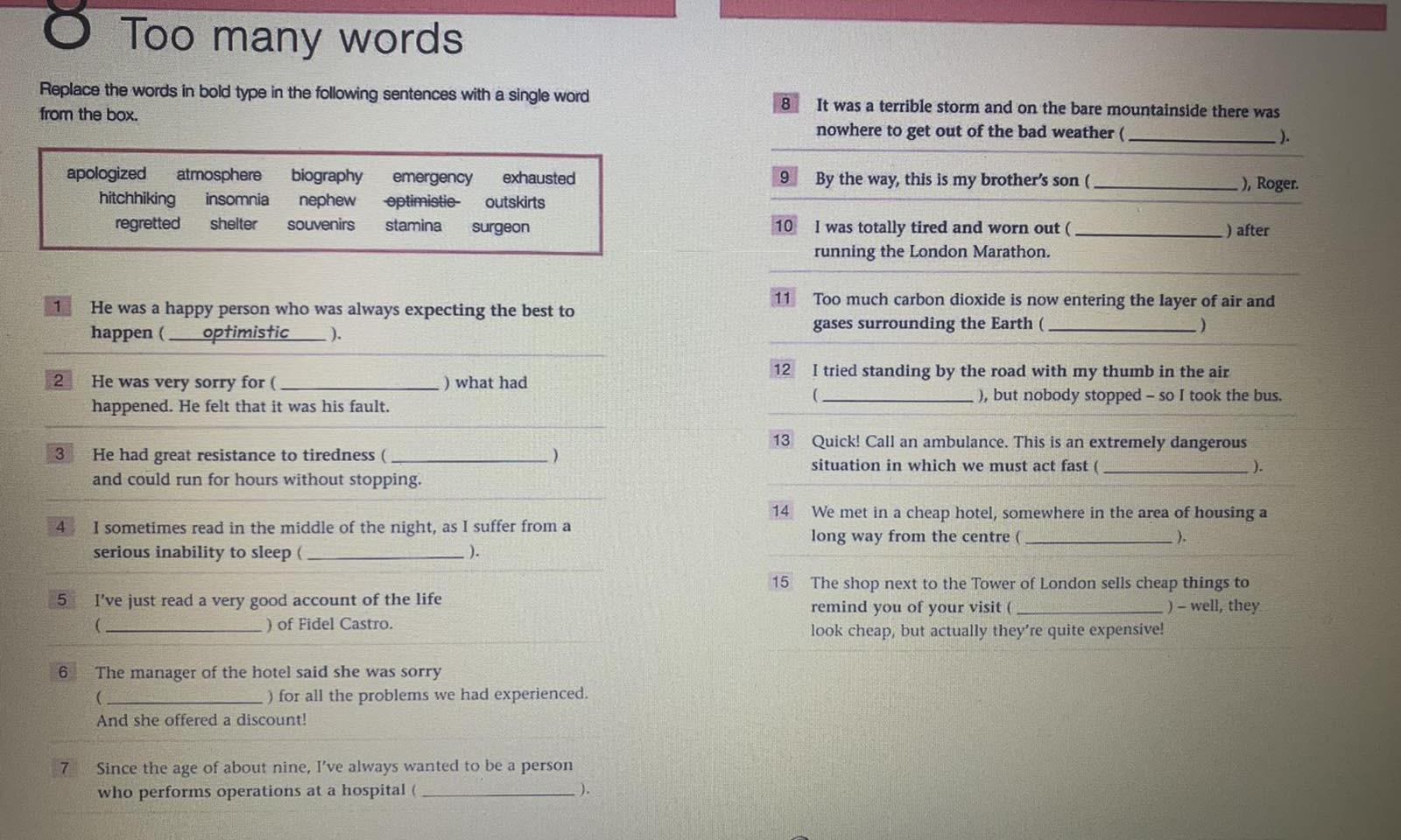 8 Too many words Replace the words in bold type in the following sentences with a single word from the box. 1 2 3 apologized atmosphere biography emergency exhausted hitchhiking insomnia nephew eptimistie- outskirts regretted shelter souvenirs stamina surgeon 5 6 He was a happy person who was always expecting the best to happen (. optimistic .). 7 He was very sorry for ( happened. He felt that it was his fault. 4 I sometimes read in the middle of the night, as I suffer from a serious inability to sleep (. He had great resistance to tiredness (. and could run for hours without stopping. ) what had I've just read a very good account of the life ) of Fidel Castro. The manager of the hotel said she was sorry ( ) for all the problems we had experienced. And she offered a discount! Since the age of about nine, I've always wanted to be a person who performs operations at a hospital ( ). 8 9 10 13 14 It was a terrible storm and on the bare mountainside there was nowhere to get out of the bad weather ( .). 15 By the way, this is my brother's son ( I was totally tired and worn out ( running the London Marathon. 11 Too much carbon dioxide is now entering the layer of air and gases surrounding the Earth ( 12 I tried standing by the road with my thumb in the air ( .), Roger. ) after P .), but nobody stopped - so I took the bus. Quick! Call an ambulance. This is an extremely dangerous situation in which we must act fast ( ). We met in a cheap hotel, somewhere in the area of housing a long way from the centre ( ). The shop next to the Tower of London sells cheap things to remind you of your visit ( ) - well, they look cheap, but actually they're quite expensive! When you learn a new word, you often meat it again very soon in your marinn It's a nieacant inrise but it likely to hannen it you don't mad