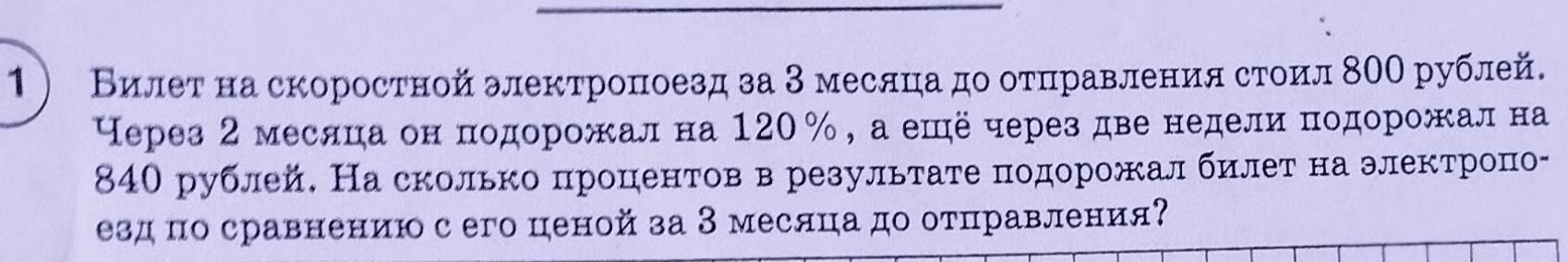 Билет на скоростной электропоезд за 3 месяца до отправления стоил 800 рублей Через 2 месяца он подорожал на 10%, а ещё через две недели подорожал на 840 рублей. На сколько процентов в результате подорожал билет на электропоезд по сравнению с его ценой за 3 месяца до отправления?