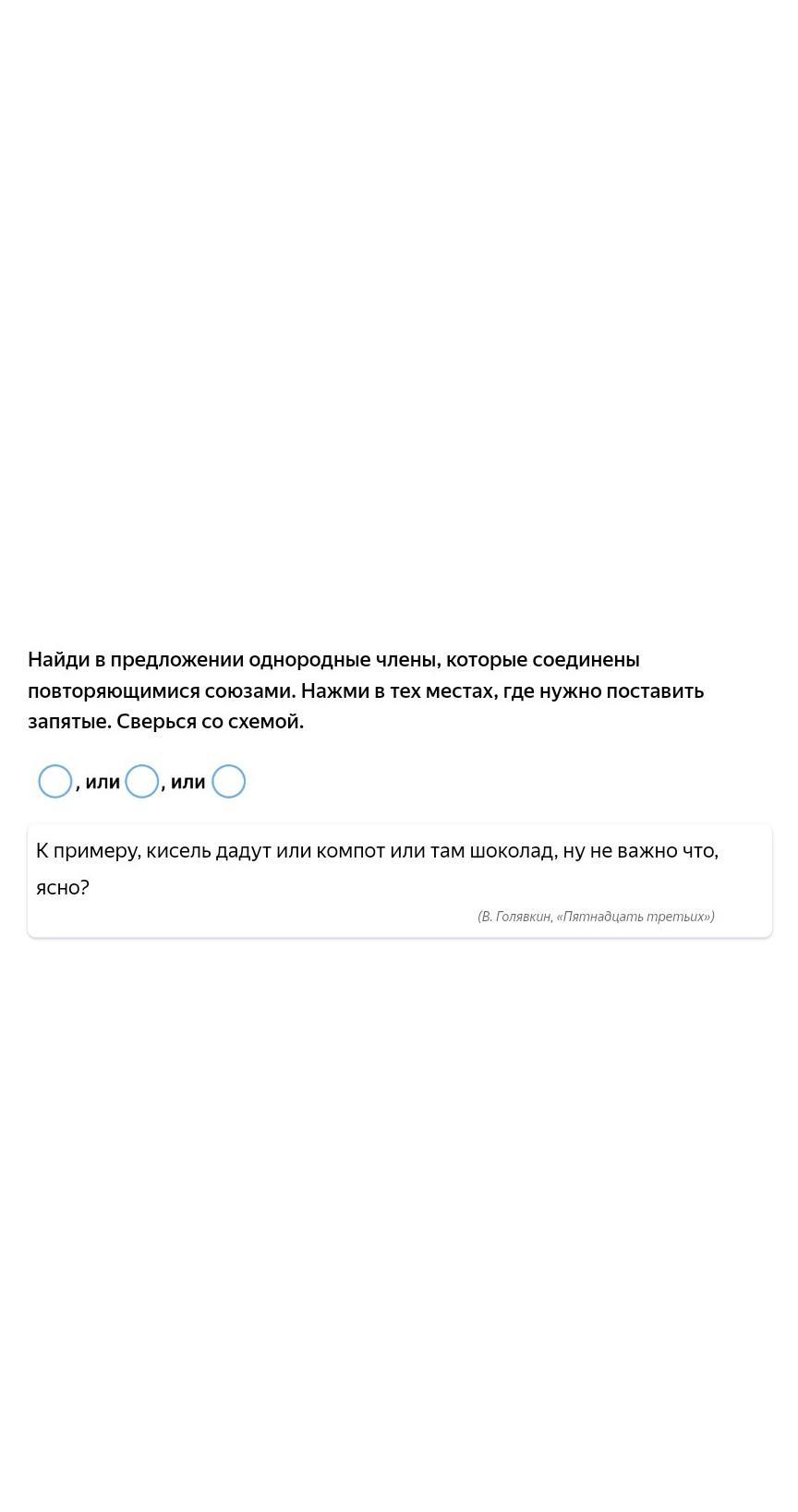 Найди в предложении однородные члены, которые соединены повторяющимися союзами. Нажми в тех местах, где нужно поставить запятые. Сверься со схемой. , или или К примеру, кисель дадут или компот или там шоколад, ну не важно что, ясно? (В. Голявкин,