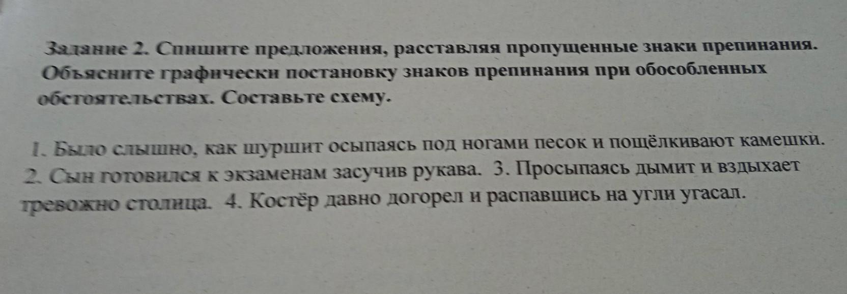 Задание 2. Спишите предложення, расставляя пропущенные знаки препинания. Обьясните графически постановку знаков препинания при обособленных обстоятельствах. Составьте схему. 1. Было слышно, как шуршит осыпаясь под ногами песок и пощёлкивают камешки. 2. Сын готовился к экзаменам засучив рукава. 3. Просыпаясь дымит и вздыхает тревожно столица. 4. Костёр давно догорел и распавшись на угли угасал.