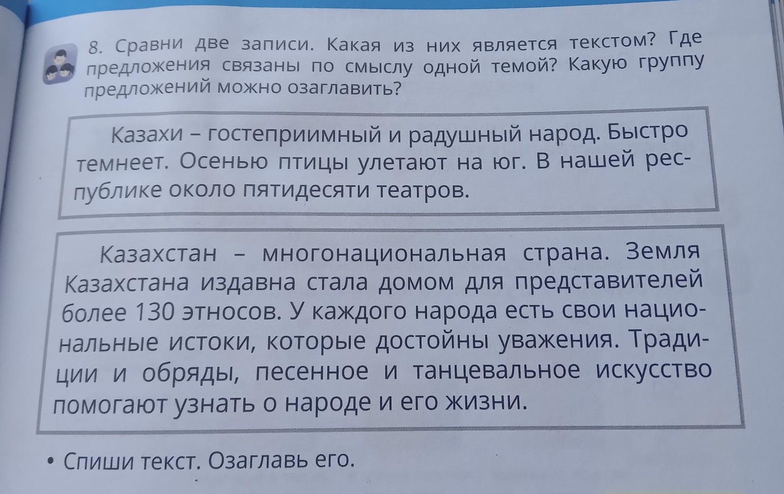 8. Сравни две записи. Какая из них является текстом? Где предложения связаны по смыслу одной темой? Какую группу предложений можно озаглавить? Казахи - гостеприимный и радушный народ. Быстро темнеет. Осенью птицы улетают на юг. В нашей рес- публике около пятидесяти театров. Казахстан многонациональная страна. Земля Казахстана издавна стала домом для представителей более 130 этносов. У каждого народа есть свои нацио- нальные истоки, которые достойны уважения. Тради- ции и обряды, песенное и танцевальное искусство помогают узнать о народе и его жизни. • Спиши текст. Озаглавь его. МНЕ НУЖНО ПРОСТО НАЗВАНИЯ ЭТИХ ТЕКСТОВ 1 И 2 ТЕКСТА ПОМОГИТЕ ПОЖАЛУЙСТА ДАЮ 50 БАЛОВ
