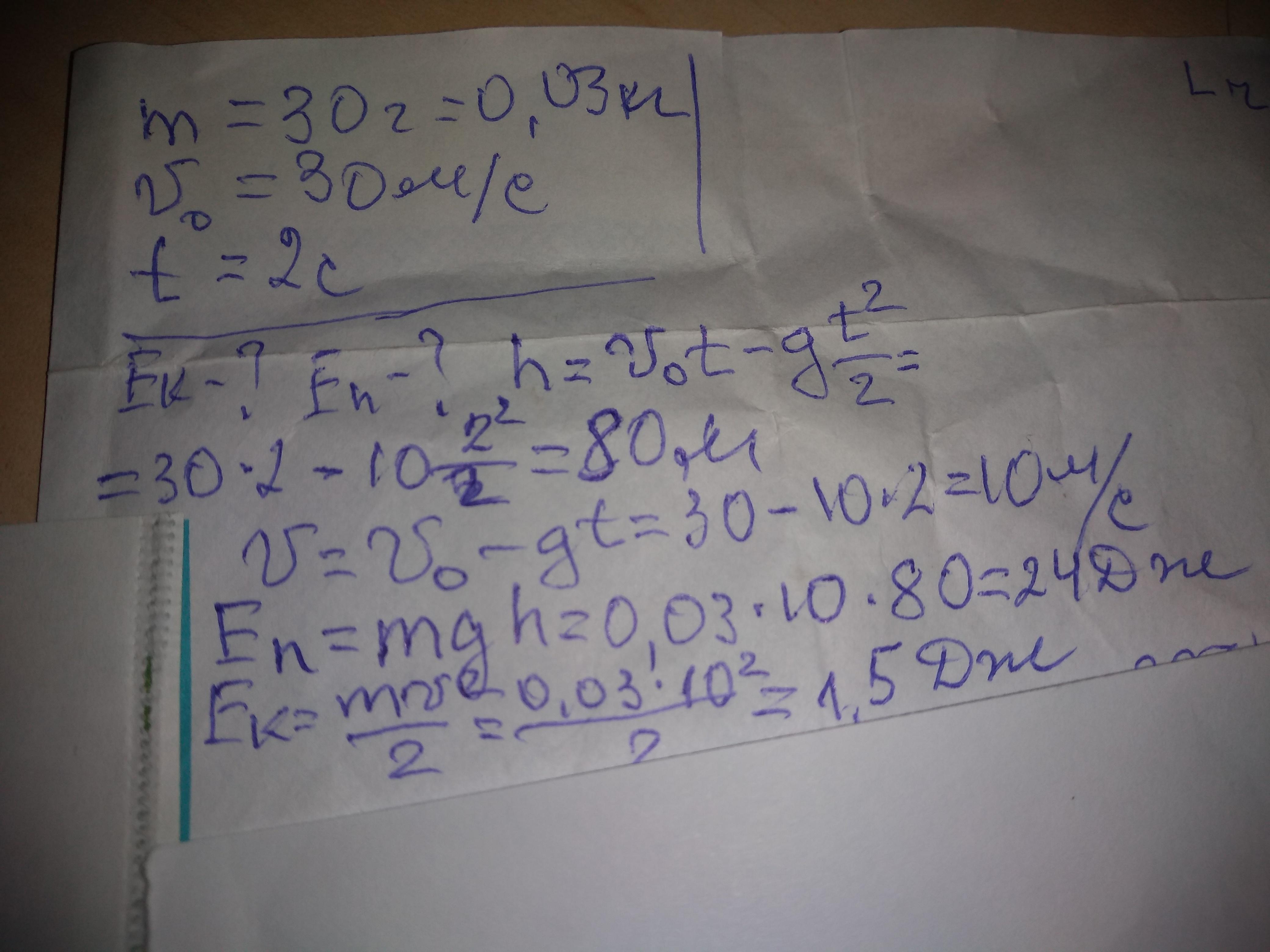 Чому дорівнює кінетична та потенціальна енергії стріли масою 30 г, яку випустили з лука зі швидкістю 30 м/ c вертикально вгору, через 2 с після початку руху?