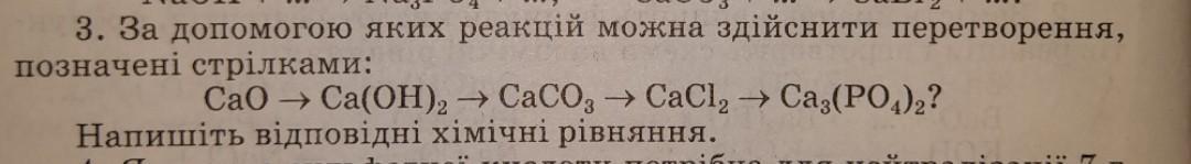 допомогою яких реакцій можна здійснити перетворення, позначені стрілками: CaO → Ca(OH)2 → CaCO3 → CaCl2 → Ca3(PO4)2? Напишіть відповідні хімічні рівняння.
