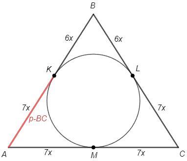 AK=7x, BK=6x => BC=AB=13x