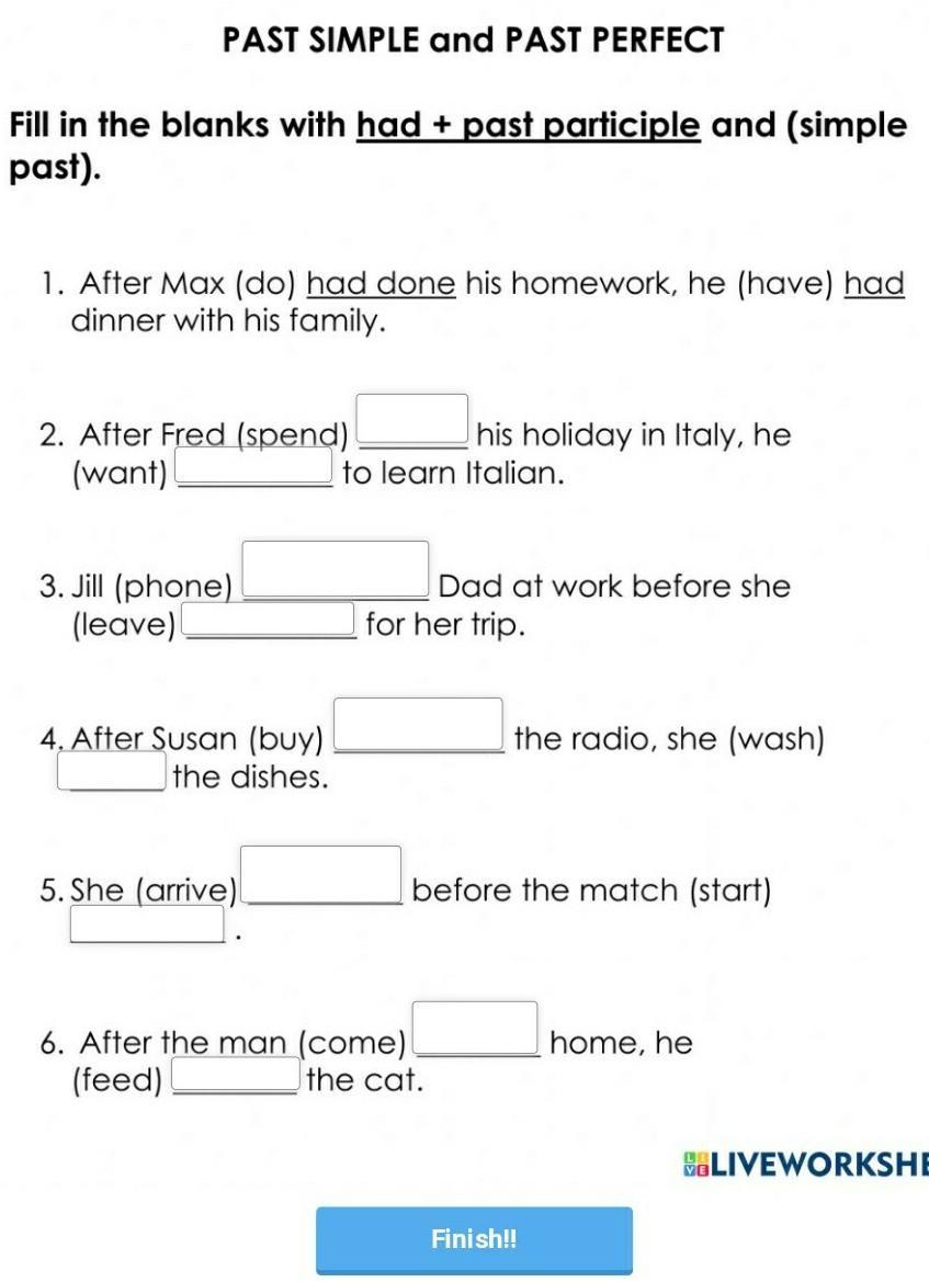 2. Had spent, wanted. 3. Phoned, had left, 4. Had bought, washed, 5. Arrived, had started, 6. Had come,