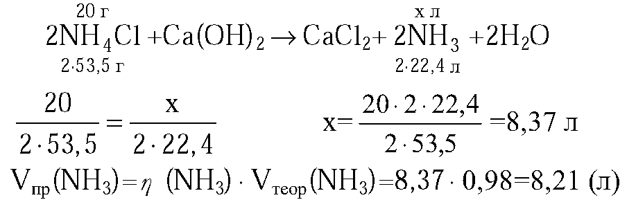 срочно вычислите объем аммиака который можно получить при нагревании 21,4г хлорида аммония с избыком гидроксида кальция если дол выхода продукта составляет 20%