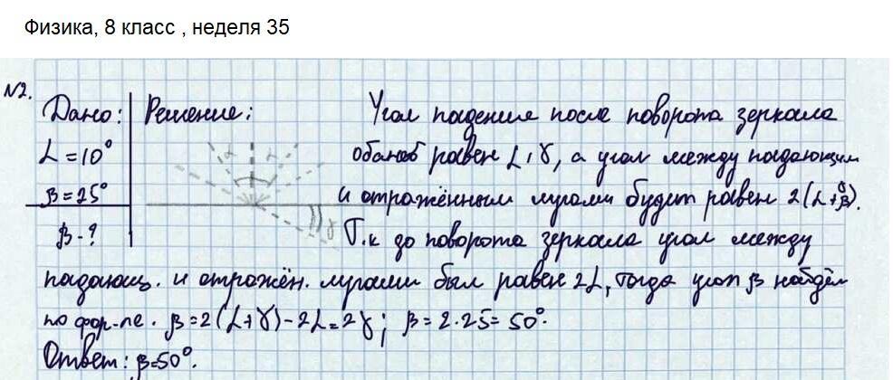 плоское зеркало может вращаться вокруг горизонтальной оси. луч лазерной указки падает на зеркало под углом 10°. на какой угол повернется отраженный луч, если зеркало повернется на 25°. помогите пожалуйста