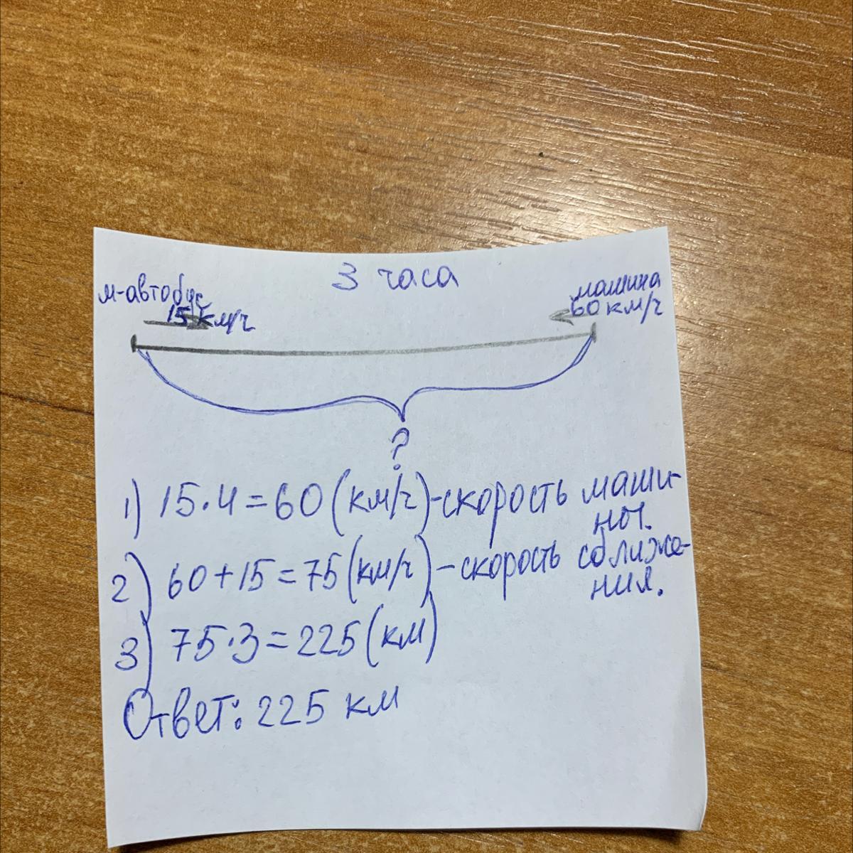 5 Сделай чертёж и реши задачу. От двух смотровых площадок на космодроме отъехали оД- новременно навстречу друг другу легковая машина и микро- автобус с туристами и встретились через 3 часа. Скорость микроавтобуса - 15 км/ч, скорость машины - в 4 раза боль- ше. Найди расстояние между смотровыми площадками.