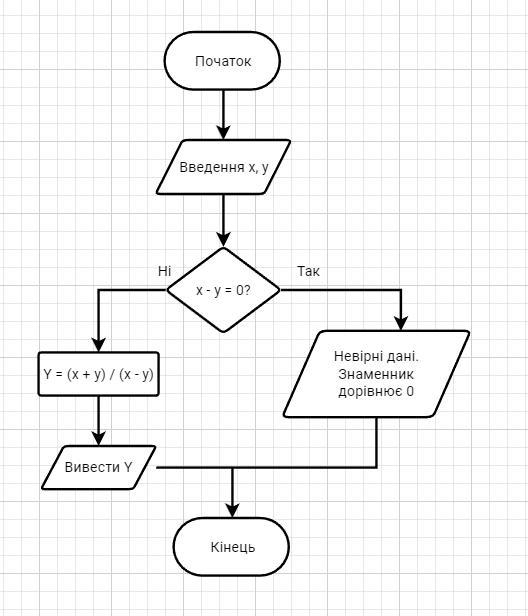 Створюючи цю блок-схему, ми повинні розуміти, що на 0 ми не ділимо (це не має сенсу). Тому, якщо вираз x - y набуває значення 0, сповіщуємо про помилку.