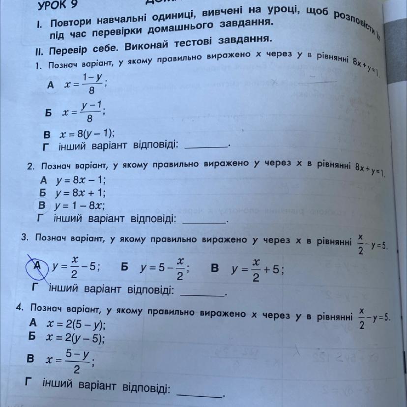 4. Познач варіант, у якому правильно виражено х через у в рівнянні