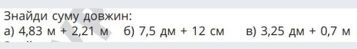 Знайди суму довжин: a) 4,83 м + 2,21 м 6) 7,5 дм + 12 CM в) 3,25 дм + 0,7 м