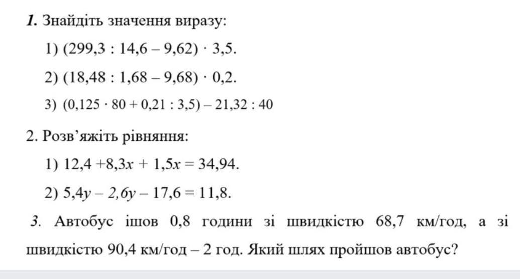 3. Автобус ішов 0,8 години зі швидкістю 68,7 км/год, а зі швидкістю 90,4 км/год - 2 год. Який шлях пройшов автобус,