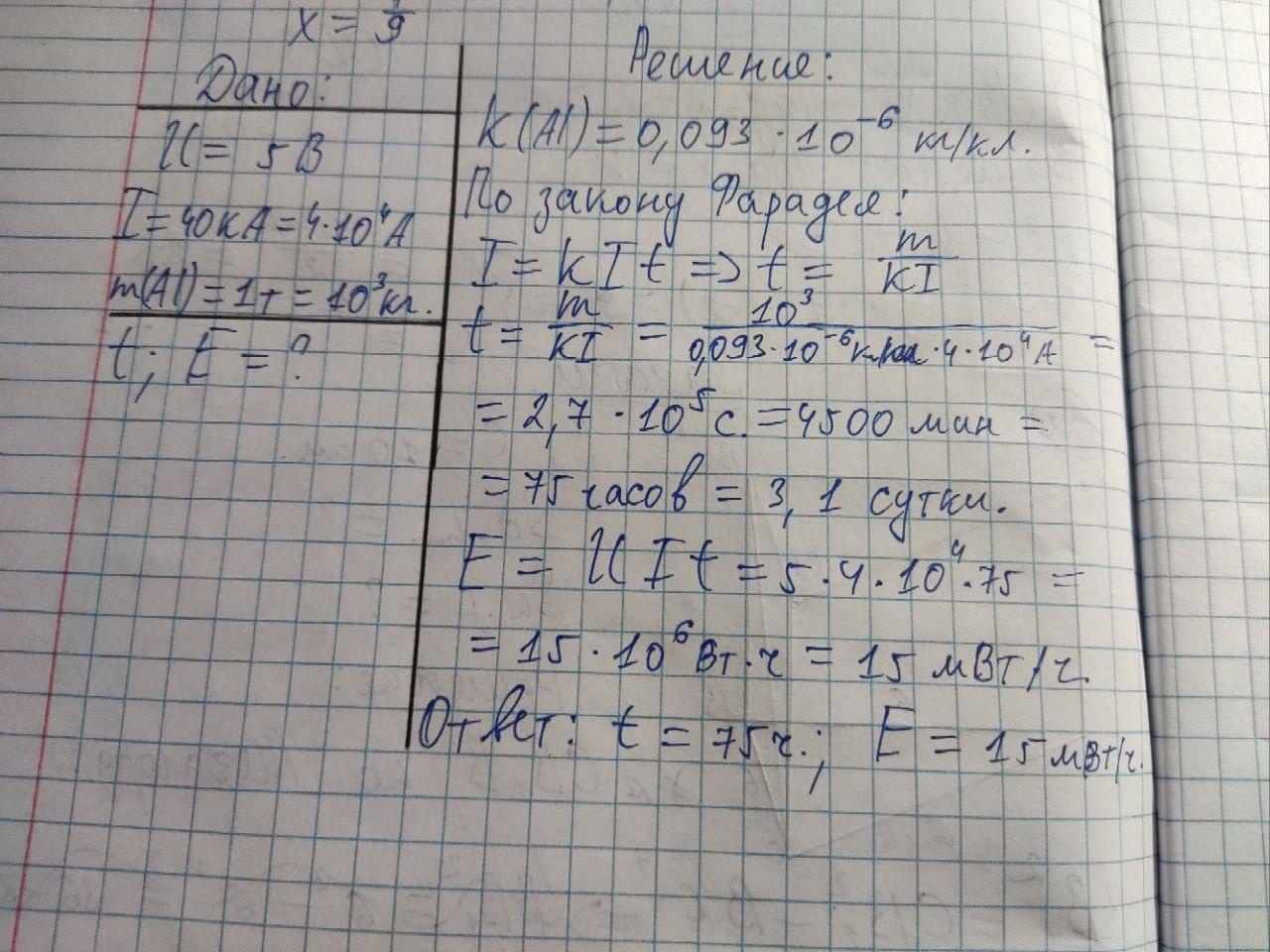 Для електролітичного добування алюмінію використовують ванни, які працюють під напругою 5В і силою струму 40кА. За який час можна добути 1т алюмінію і скільки при цьому витрачається електроенергії?