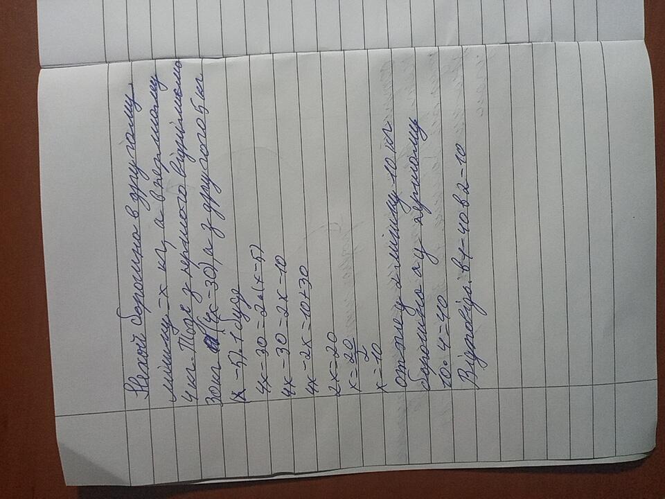 У першому мішку в 4 рази більше борошна, ніж у другому. Коли з першого мішка взяли 30 кг борошна, а з другого- 5 кг, то в першому мішку стало в 2 рази більше, ніж у другому. Скільки кілограмів борошна було в кожному мішку спочатку? Яке з рівнянь відповідає умові задачі, якщо через х кг позначено масу борошна, що знаходилась у другому мішку?