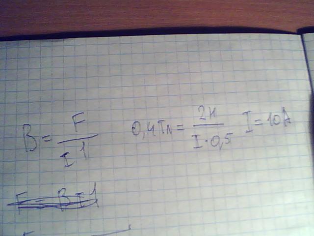 для нахождения силы тока делим силу на произведение длины проводника и индукцию:2/0.5*0.4=10