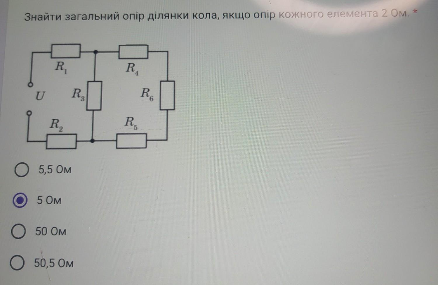 Знайти загальний опір ділянки кола, якщо опір кожного елемента 2 0м. U R₁ R₂ о 5,5 Ом 5 Ом R₂ О 50 Ом О 50,5 Ом RA R₁ R6