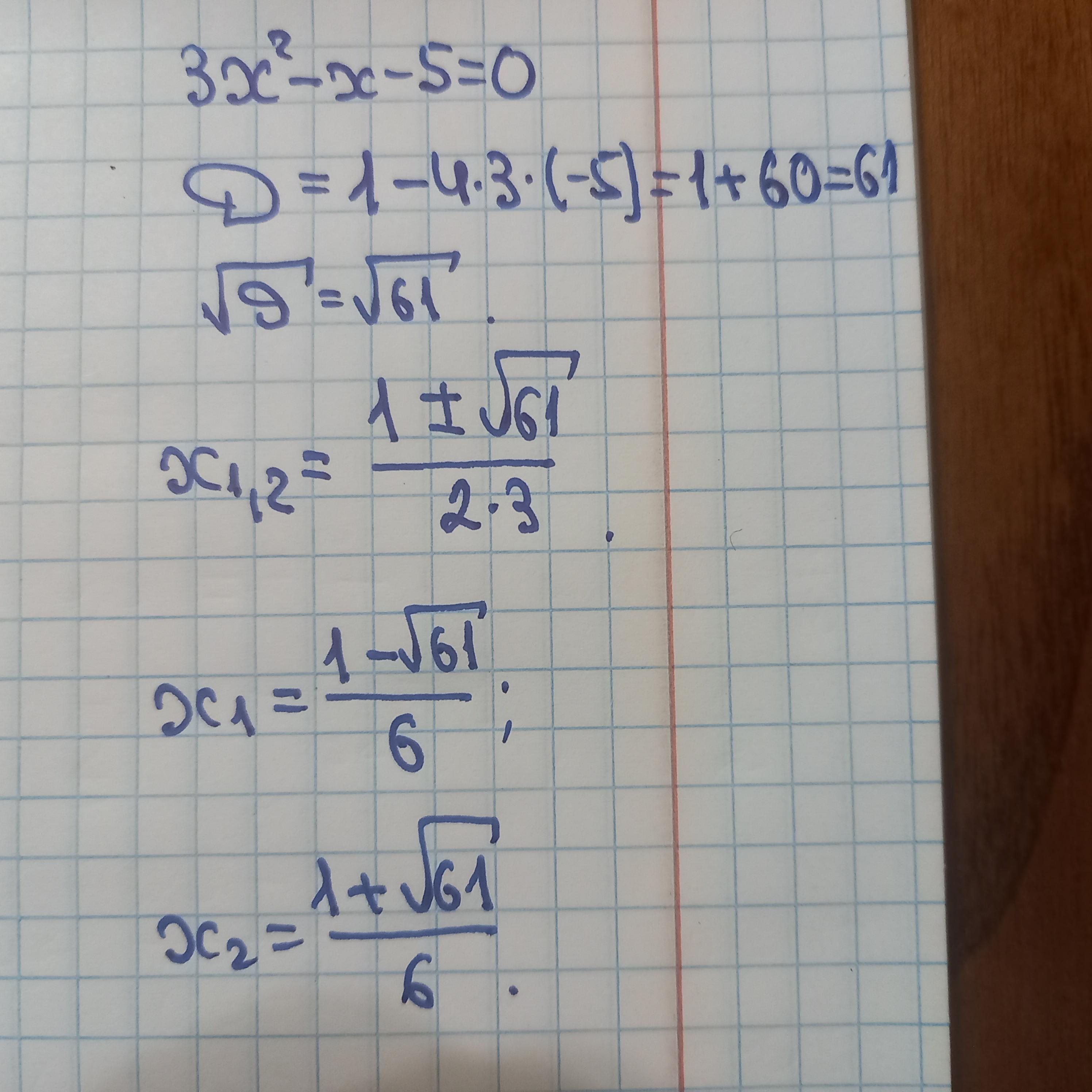 розв'яжіть рівняння 3х²-х-5=0 росписать!!!! СРОЧНО!!!❤️