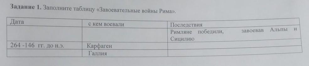 Задание 1. Заполните таблицу «Завоевательные войны Рима». Дата 264 -146 гг. до н.э. с кем воевали Карфаген Галлия Последствия Римляне победили, Сицилию завоевав Альпы И
