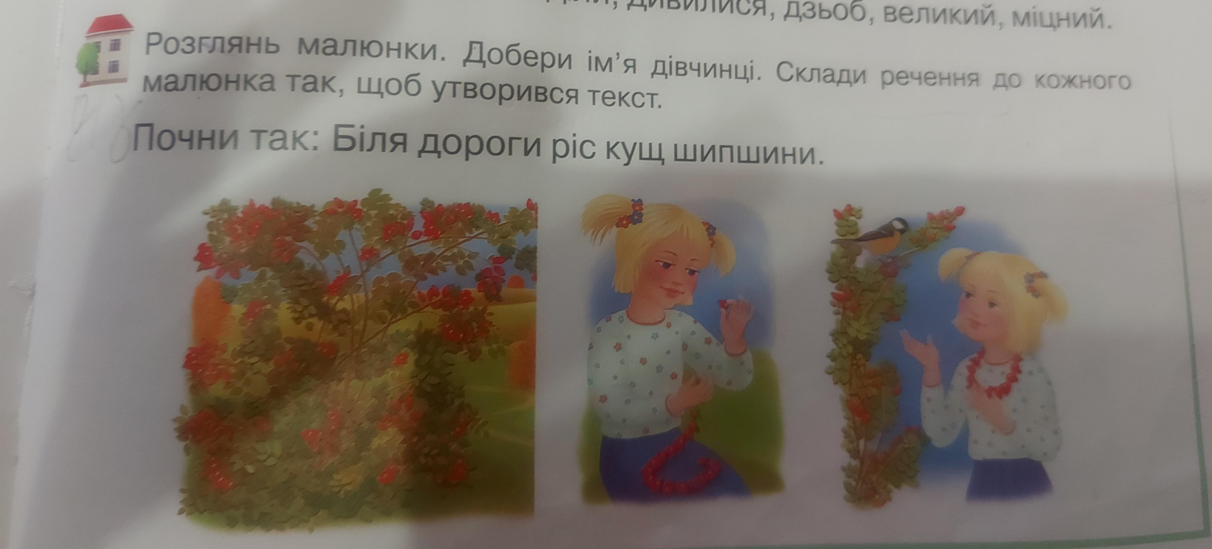біля дорого ріс кущ шипшини дівчинка Марічка підійшла до нього і почала робити з неїбуси , потім Марічка побачила горобця який підлетів до куща шипшини ,та почав їсти її