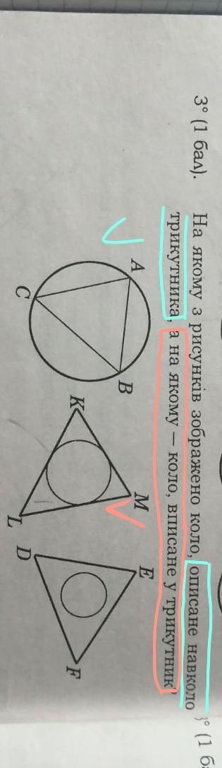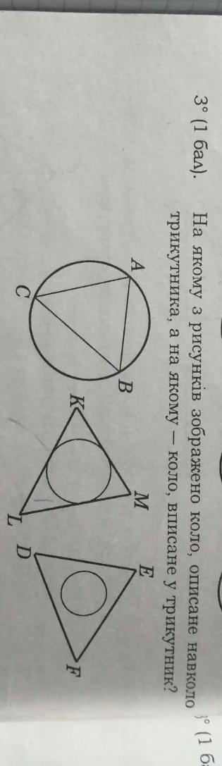 На 1 малюнку коло, описание навколо трикутника, тому що усі кути трикутника доторкаються до кола.