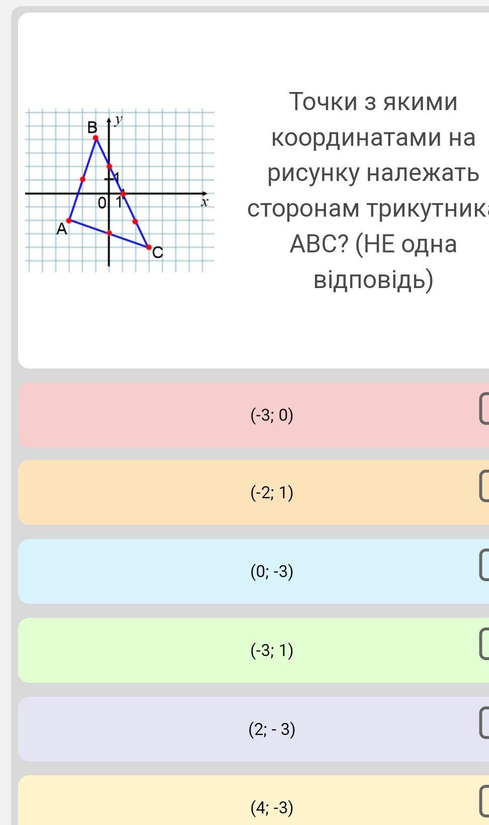 A B 1 C Точки з якими координатами на рисунку належать сторонам трикутника ABC? (HE одна відповідь)35 балов