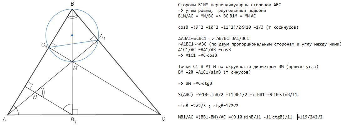 B1M/AC =BC/AC cosC ctgA =10/11 ⋅7/11 ⋅17/20√2 =119/242√2