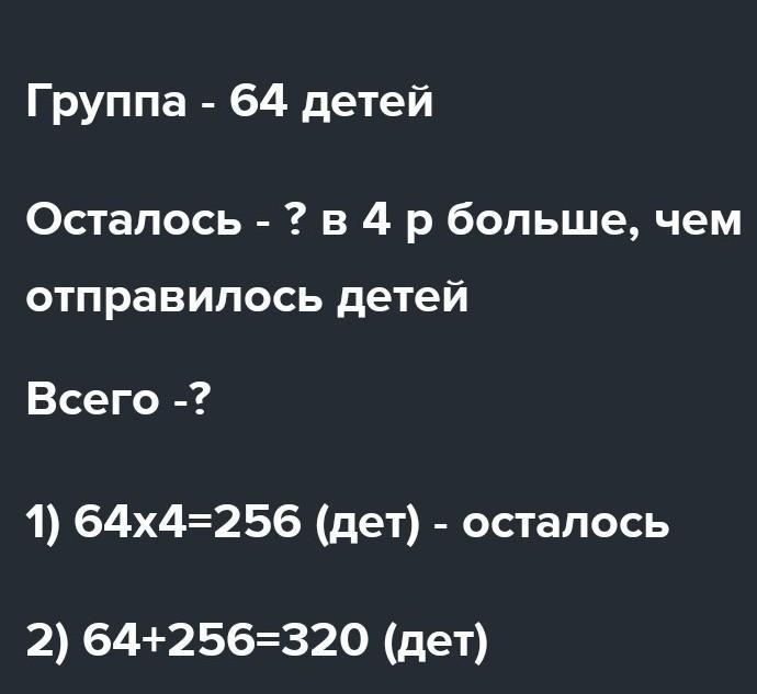 6. Реши задачи. а) В летнем лагере группа из 64 детей отправилась в поход в горы, это в 4 раза меньше, чем количество детей, оставшихся в лагере. Сколько всего детей отдыхало в лагере?
